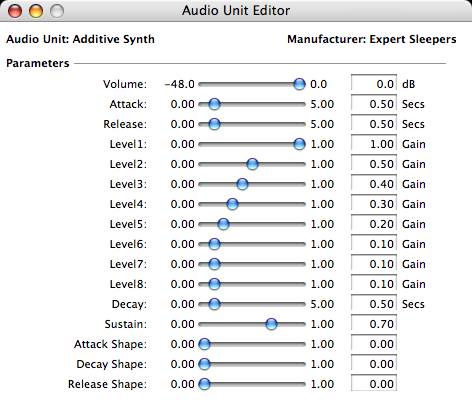 A simple synth plug-in, written mainly so I could have something to release the source of. It's a native XCode project, and should be useful reference for anyone trying to get started writing virtual instruments in AU format.
