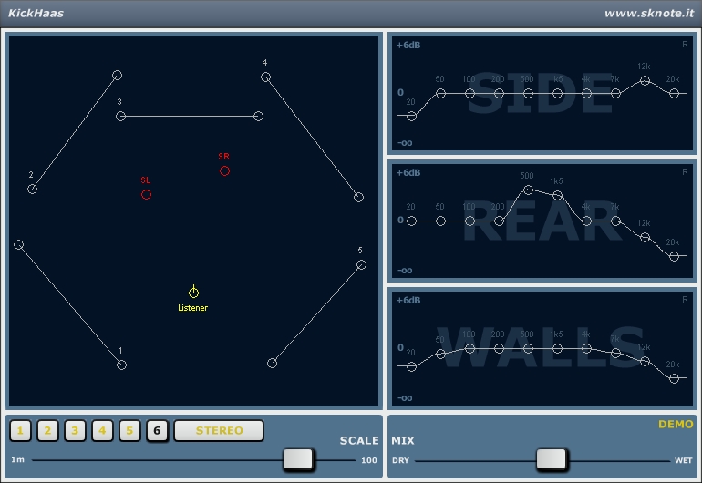 KickHaas is a "stage placement" stereo effect, useful for giving depth and dimension to mixes when you don't want to "hear the effect". It is based on delays and equalisation, but, differently from multi-tap delay effects, it is based on a geometric model of the ambience where the instruments and the listener are placed - simply place some walls (up to six), the listener and the sources to give realistic depth to the mix.
