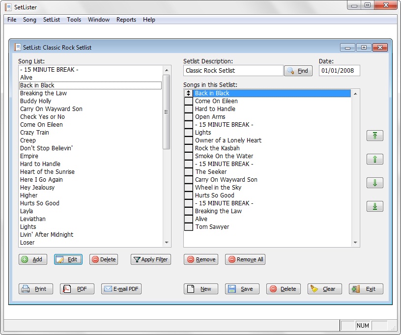* Built-in PDF creation and integrated e-mail functionality allows you to e-mail a copy of a Setlist to other band members before your next gig